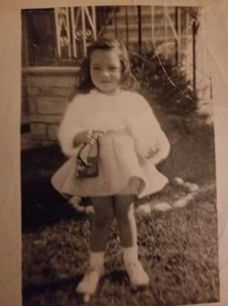To the right is a photo of when I was five years old wearing an angora sweater that my mom knitted for me.